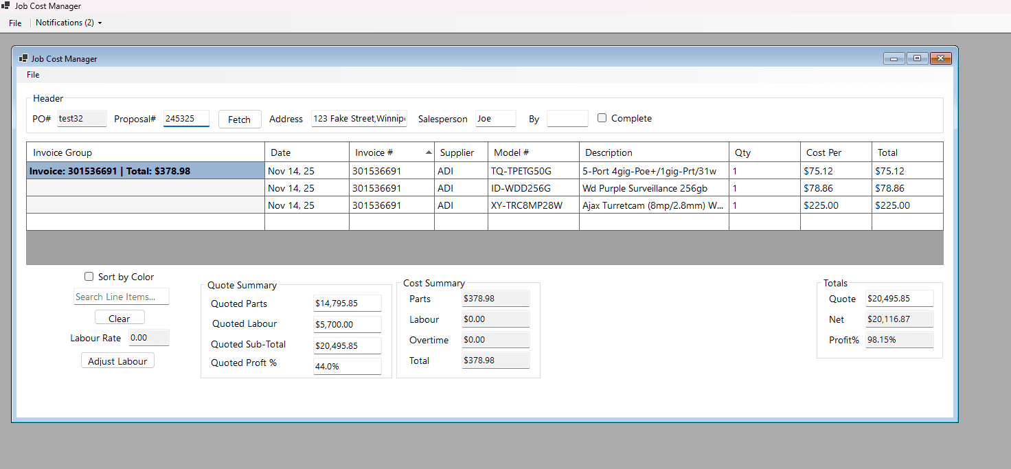 WinForms .NET 8 app for project costing, labour tracking, and sales commissions.